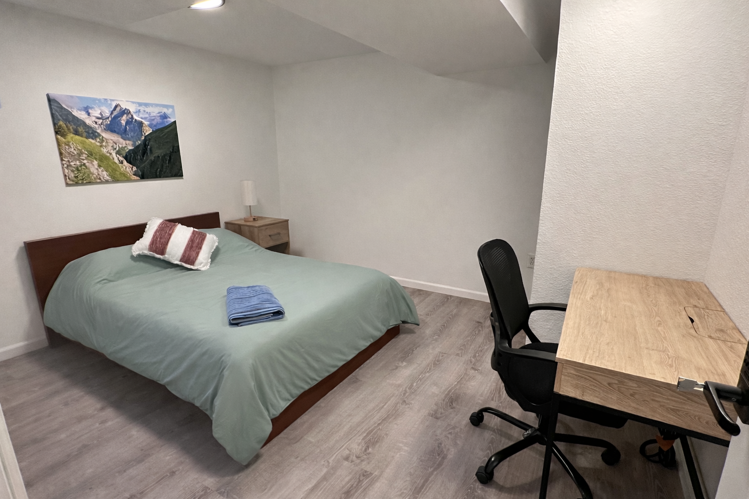 This newly renovated room is fully furnished with a cozy bed, fresh linens, nightstand, charger lamp, desk, and chair.